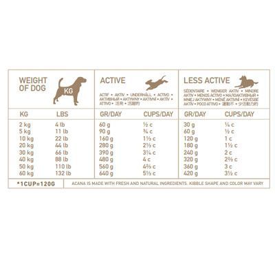 La energía metabólica de ACANA Ranchlands es 3515 kcal / kg (422 kcal por taza de 250 ml ) con 31% de proteína, 41% de res, cordero y aceite de pescado, y 28% de frutas y verduras.