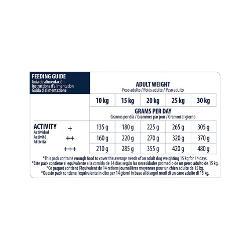 - Es un alimento indicado para perros adultos de entre 10 y 30 kg de peso que ayuda a mantener el peso óptimo gracias a su aporte protéico y protege la salud de tu mascota.