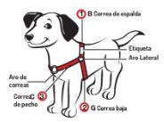 – Cuando el perro está de pie: Las anillas laterales han de estar en una posición más alto que la anilla central del pecho. La cinta pectoral ha de estar ligeramente inclinada.