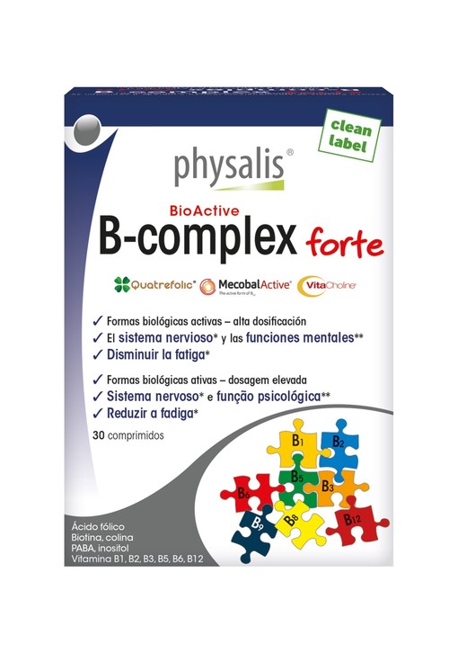 Physalis B-complex forte es un complejo de nutrientes que contiene todas las vitaminas del grupo B, a dosis altas y en su forma biológica activa más asimilable. *Las vitaminas B2, B3, B5, B6 y B12 contribuyen a disminuir la fatiga y se sabe que apoyan el sistema nervioso. **La biotina y el ácido fólico mejoran las funciones mentales. Con VitaCholine®, inositol y PABA.