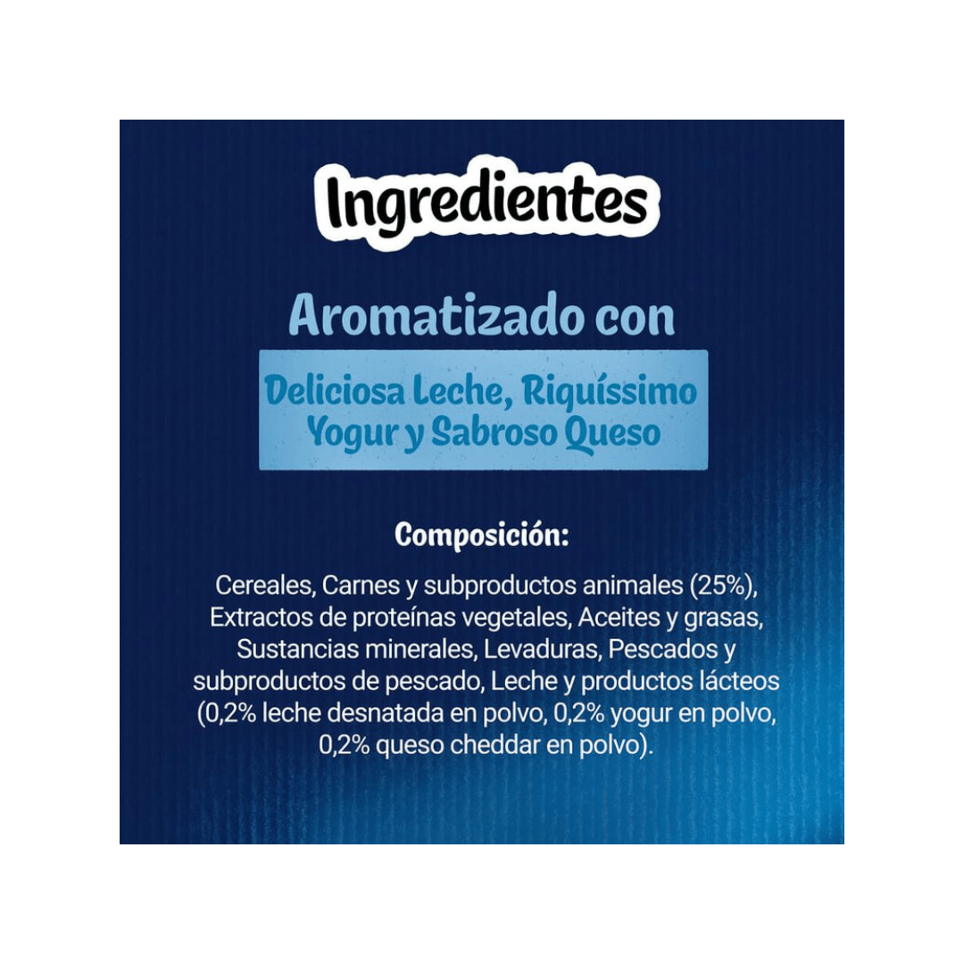 Carnes y subproductos de origen animal (35%) *, Cereales, Aceites y grasas, Extractos de proteínas vegetales, Sustancias minerales, Azúcares, Levaduras, Peces y subproductos de pescado, Leche y productos lácteos (0,2% leche desnatada en polvo, 0,2% yogurt en polvo, 0,2% queso cheddar en polvo) **.