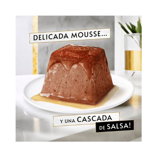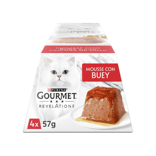 Las Mousse Gourmet Revelation están disponibles en varios sabores como pollo, buey, salmón y atún para que tu gato pueda disfrutar de uno diferente cada día. El formato pirámide de mousse de carne y la cascada de salsa que cae por encima, satisfacerá incluso a los paladares más exquisitos.