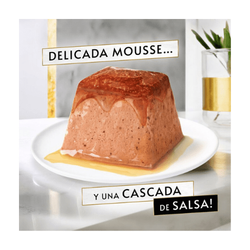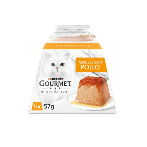 Las Mousse Gourmet Revelation están disponibles en varios sabores como pollo, buey, salmón y atún para que tu gato pueda disfrutar de uno diferente cada día. El formato pirámide de mousse de carne y la cascada de salsa que cae por encima, satisfacerá incluso a los paladares más exquisitos.