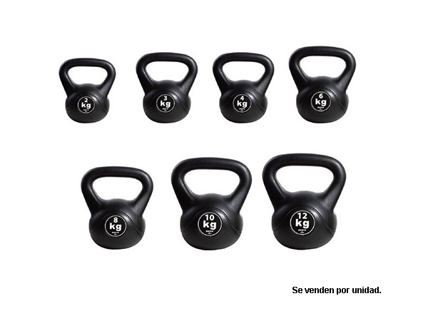 Kettlebell. También conocido como pesa rusa. Pesa con asa fabricada en vinilo con cemento en su interior. Tamaño según peso, a mayor peso, mayor tamaño. Precio por unidad. Color: negro.