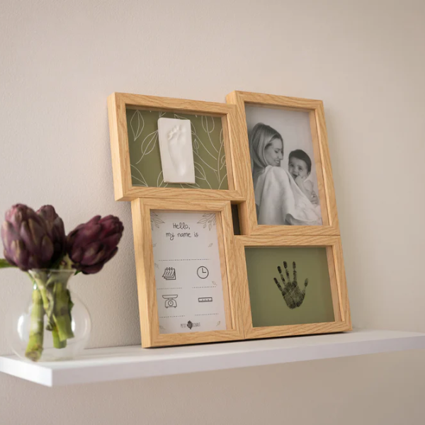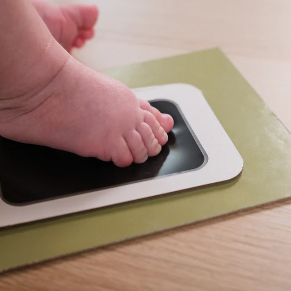 El marco portafotos puzzle Olive Tree es una agrupación de varios marcos individuales para exponer la foto del bebé y sus huellas con arcilla y tinta. También viene con un cartel de nacimiento para escribir toda la información del nacimiento: nombre, peso, altura, ¡así como la hora y el día de la llegada del bebé! Los fondos de los marcos se pueden personalizar con un estampado de hojas o un color verde liso. El kit incluye arcilla hipoalergénica, rodillo, tampón para sellos sin tinta e instrucciones para crear fácilmente tus estampados. La tecnología «Smart Inkless Touch» garantiza impresiones muy detalladas sin necesidad de que la piel del bebé entre en contacto con la tinta.