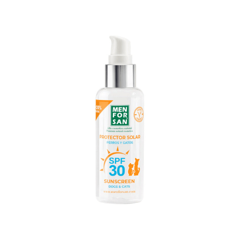 Leche solar con protección 30 para hidratar y proteger las partes más sensibles de la piel de nuestro perro o gato de las peligrosas radiaciones UVA y UVB. Fórmula hipoalergénica y sin perfume.