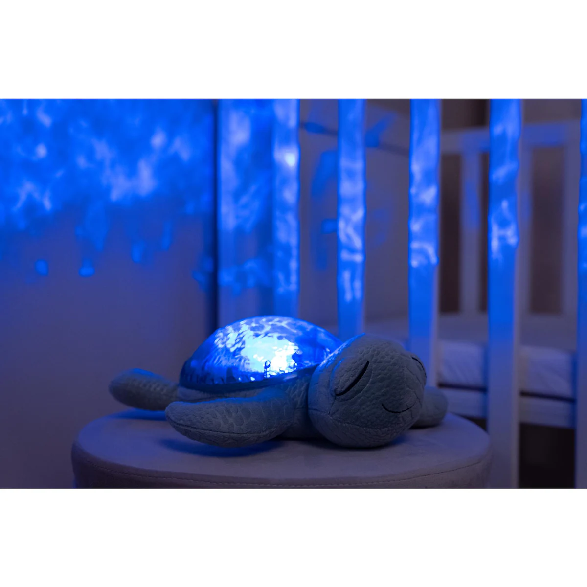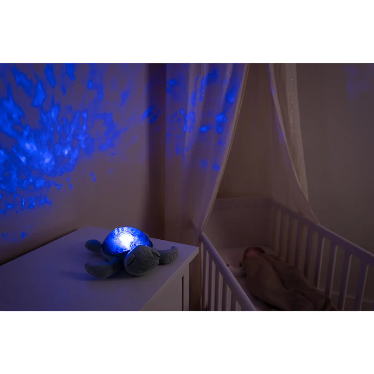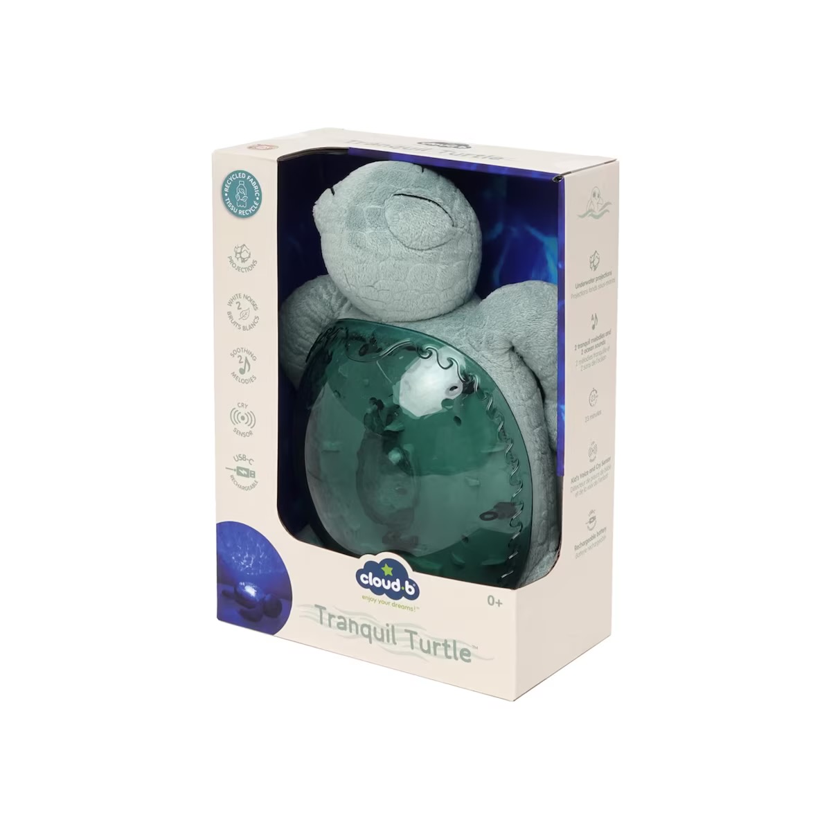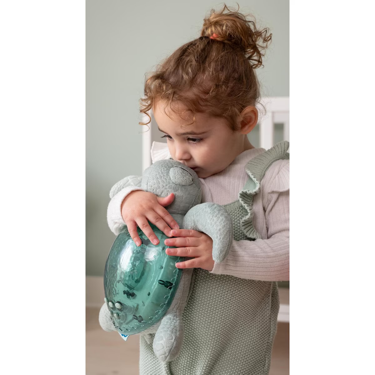 La luz nocturna Tranquil Turtle™ Recargable – Verde calma al bebé y tranquiliza a los niños que tienen miedo a la oscuridad. Suave peluche durante el día, se transforma en luz nocturna por la noche. Su efecto de luz submarina es mágico, gracias a la proyección de olas en movimiento. Melodías y ruidos blancos tranquilizarán a los más pequeños para llevarlos camino del sueño. Dispone de 4 sonidos relajantes: melodía subacuática, melodía tranquila, canto de ballena , olas del mar (ruido blanco) y 6 niveles de volumen ajustables. Un dispositivo inteligente Sensor de llanto, con sensibilidad ajustable, se activa automáticamente al primer llanto del bebé.